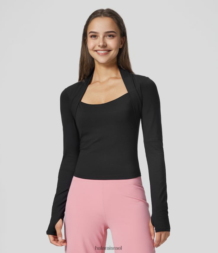 - חורי אגודל עוזרים לשמור על תזוזה של השרוולים והחפתים, תוך מתן כיסוי קל.