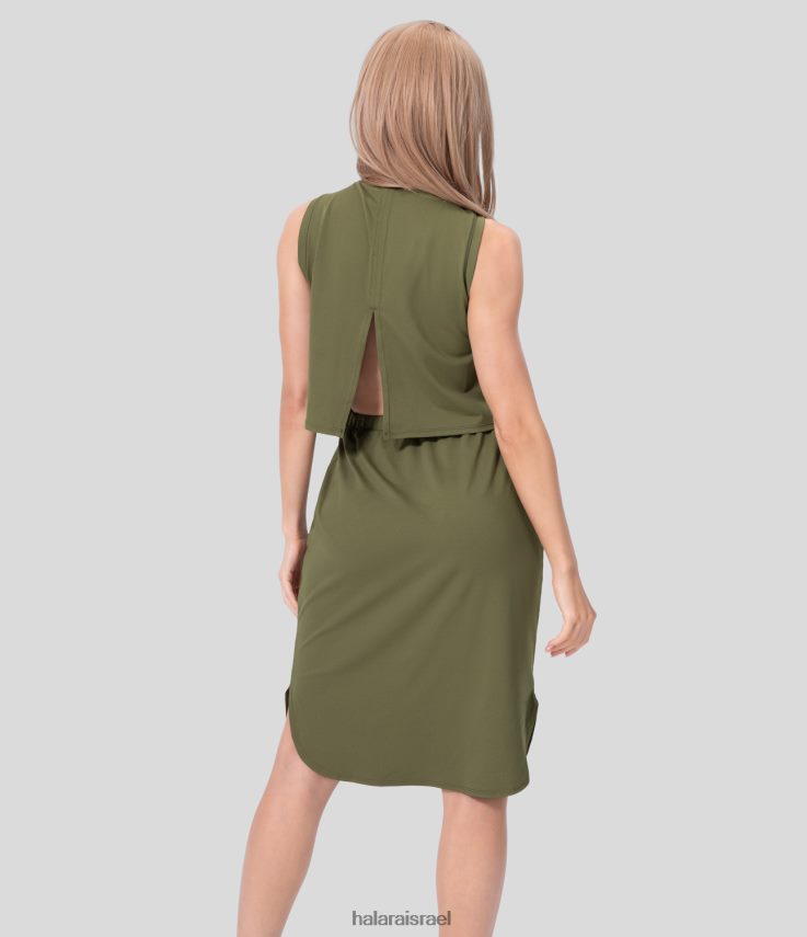 Halara נשים כיס צדדי ללא שרוולים עם צווארון עגול חתוך מכפלת מעוקלת שמלת מידי קז’ואל בחתיכה אחת XX0PF1232 הַלבָּשָׁה קפלת זית