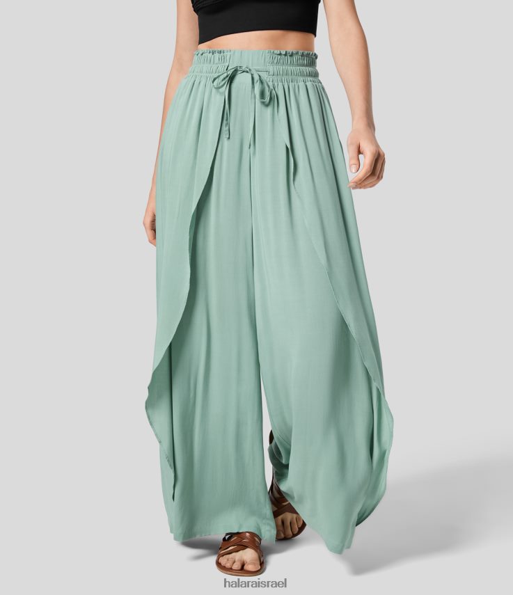 Halara נשים מכנסיים קז’ואל מזדמנים בגזרת מותן גבוהה עם שרוך שרוך כיס צד רחב רגל זורחת XX0PF151 הַלבָּשָׁה ציאן מעושן