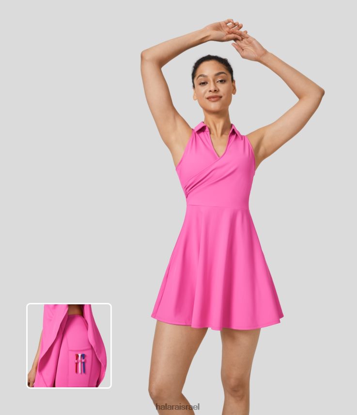 Halara נשים צווארון V משופשף ללא שרוולים 2 חלקים כיס צד מתלקח מיני מהיר יבש גולף שמלה אקטיבית-כיס טי גולף XX0PF825 בגדים פעילים ורוד פודרה מדהים