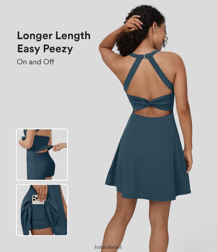 Halara נשים ריקודי ריקוד פעיל ללא גב ללא גב – שמלה פעילה באורך ארוך יותר – מהדורת פיזי קלה XX0PF771 בגדים פעילים כחול מיוליקה