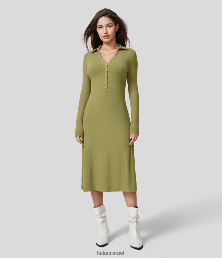 Halara נשים שמלת מידי קז’ואלית עם כפתור צווארון הנלי עם שרוולים ארוכים XX0PF1169 הַלבָּשָׁה זית ירוק