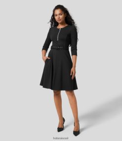 Halara נשים רוכסן עגול צווארון עגול כיס צדדי שמלת עבודה בהתאמה והתלקחות XX0PF1160 הַלבָּשָׁה שָׁחוֹר