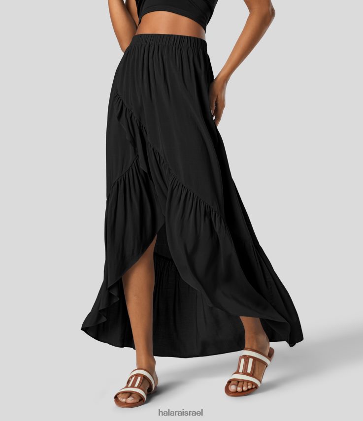 Halara נשים מותניים גבוהים משוכפלים גבוה נמוך מכפלת מלמלה זורמת חצאית מקסי נופש XX0PF720 הַלבָּשָׁה שָׁחוֹר