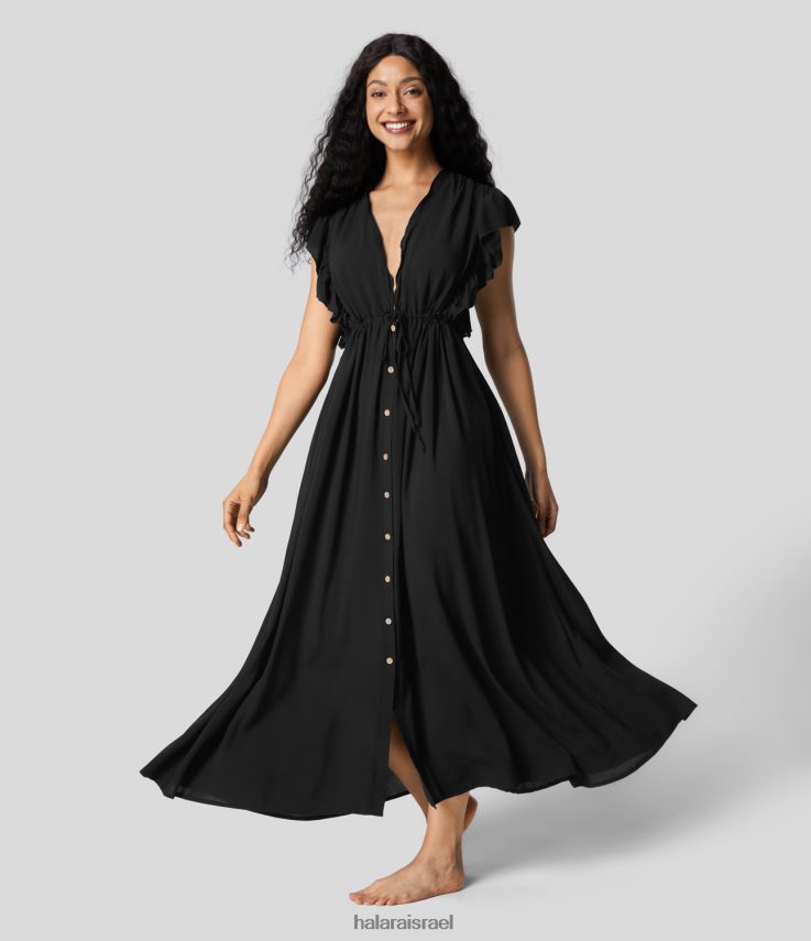Halara נשים שרוול פרפר עם צווארון V עמוק ללא גב כפתור שרוך צד כיס שוטף שמלת קז’ואל מקסי XX0PF1145 הַלבָּשָׁה שָׁחוֹר