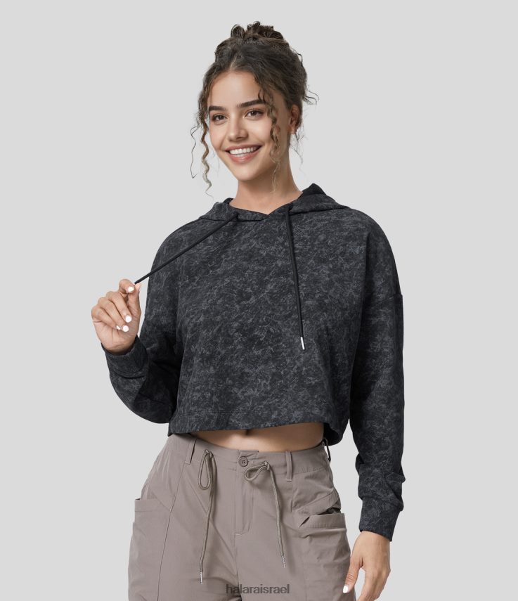 Halara נשים שרוך שרוך עם קפוצ’ון נשמט כתף קצוץ מכובס קז’ואל ספורט סווטשירט כותנה XX0PF1963 בגדים פעילים עשן כהה אפור