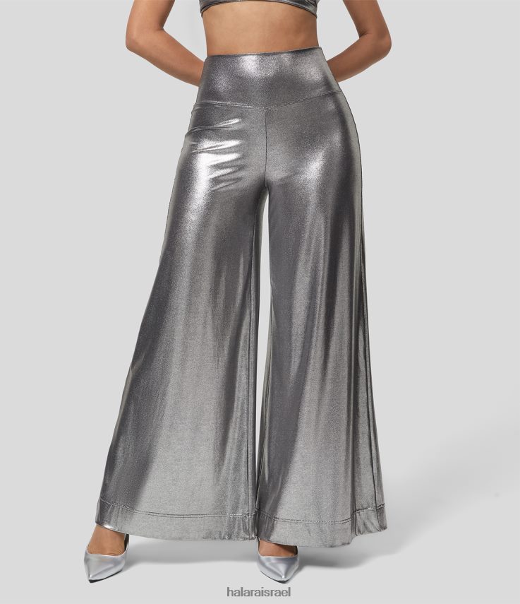 Halara נשים softlyzero דמוי עור עם מותניים רחבה רגליים מתכתיות עם הדפס נייר כסף נמתח XX0PF206 בגדים פעילים כסף שחור מבריק