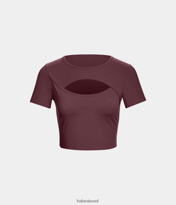 Halara נשים softlyzero צוואר עגול קטיפה חתוך חתוך סרגל בלט ריקוד ספורט טופ XX0PF1812 בגדים פעילים מהגוני אדום